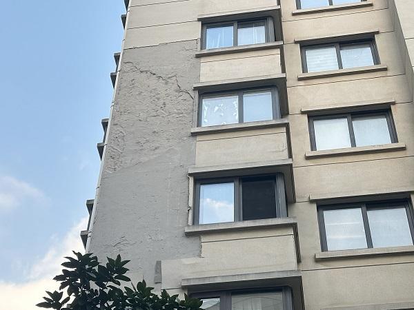 居民称,本年9月16日台风“贝碧嘉”来袭,10号楼墙皮霎时大面积剥落。记者看到,剥落区域位于10号楼5至7层西侧外墙,事发时陨落的碎石和墙皮如今已经残留在1楼过说念大地上。